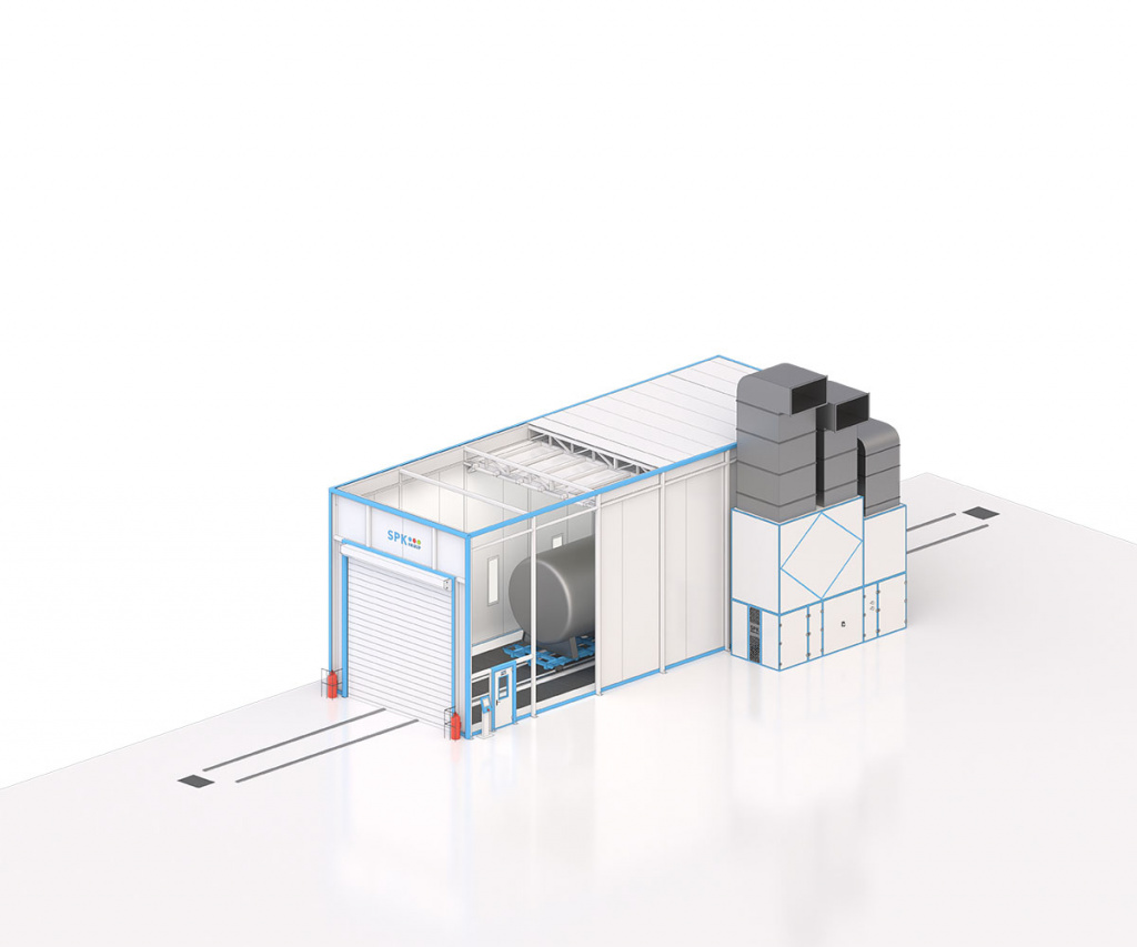 Окрасочно-сушильная камера проходного типа SPK-SCB-18.6.6 (далее — ОСК) предназначена для подготовки изделий к покраске, нанесения на них лакокрасочных покрытий и их сушки при повышенной температуре. В камере обеспечивается равномерный поток очищенного, подогретого воздуха. Направление потока воздуха — сверху вниз камеры. Камера имеет сухой способ фильтрации воздуха от остатков краски. Это обеспечивает наилучшее нанесение лакокрасочного материала на подготовленное изделие и не требует реализации дополнительных очистных сооружений.